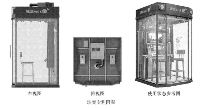 涉案專(zhuān)利由主視圖、后視圖、俯視圖、左視圖、右視圖和使用狀態(tài)參考圖表示,簡(jiǎn)要說(shuō)明記載省略仰視圖。如圖所示,涉案專(zhuān)利整體近似長(cháng)方體,長(cháng)寬高比例約為1:1:2,從俯視圖觀(guān)察整個(gè)產(chǎn)品正面呈形,左邊1/5和右邊1/5為斜切面,涉案專(zhuān)利頂部1/6為頂棚,頂棚頂部有一些凸出的結構和部件,頂棚正面和左右側面分別有“咪噠miniK”的文字及近似音符的圖案,斜切面上有微凸的正方形,內有“⑧”圖案,涉案專(zhuān)利底部為較薄的底板,頂棚和底板間面與面的銜接處均為框架結構,除了背板,框架間均為透明玻璃,玻璃頂部和底部均有大量小圓點(diǎn)圖案,正面中間為玻璃門(mén),其左部裝有“]”形把手,涉案專(zhuān)利背面有一些孔、洞結構。玻璃房?jì)?,頂棚靠近背板的一側裝有三個(gè)斜向圓柱形筒燈,靠近正面和左右側面的位置各裝有三個(gè)豎向的筒燈,背板頂部為長(cháng)方形坡面,其中間為“咪噠miniK”的文字及近似音符的圖案,左右兩邊各有一些卡通圖案,坡面下方左邊1/5和右邊1/5分別有豎條形的結構,其頂部各有一掛鉤,掛有一 “C”形耳機,坡面下方中間為娛樂(lè )主機,從側面看主機上部較薄,為屏幕,主機中部逐漸由薄變厚,正面為斜面,斜面中間有一屏幕,屏幕左右兩邊各有一麥克風(fēng),主機下部較厚,其頂部有一半突出的操控臺,操控臺上有三個(gè)圓形大旋鈕及其他操控件,操控臺下方有一長(cháng)方形機箱門(mén),機箱門(mén)下方亦有一長(cháng)方形散熱區域,主機左右兩邊各有一小桌板,桌板下有豎直的支撐桿,玻璃房?jì)冗€有兩把相同的高腳椅,椅子均有四條椅腿,椅背呈長(cháng)方形,通過(guò)三根連接桿與椅座相連,玻璃房左右側面設有窗簾。詳見(jiàn)涉案專(zhuān)利附圖。
