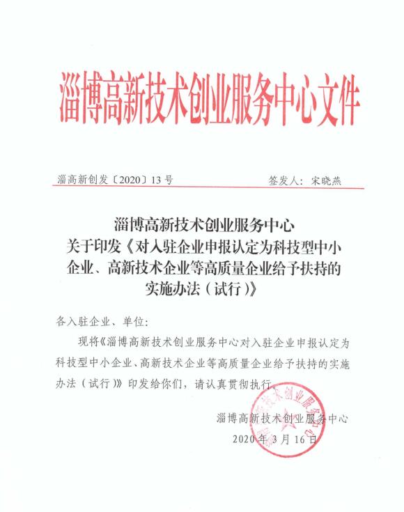 接淄博高新技術(shù)創(chuàng )業(yè)服務(wù)中心關(guān)于《對入駐企業(yè)申報認定為科技型中小企業(yè)、高新技術(shù)企業(yè)等高質(zhì)量企業(yè)給予扶持的實(shí)施辦法(試行)》通知。