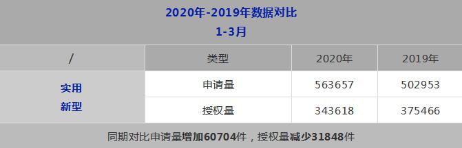 1-3 月,我國實(shí)用新型專(zhuān)利申請 56.4 萬(wàn)件,實(shí)用新型專(zhuān)利授權 34.4 萬(wàn)件。截至 2020 年 3 月底,實(shí)用新型專(zhuān)利有效 量為 545.2 萬(wàn)件。