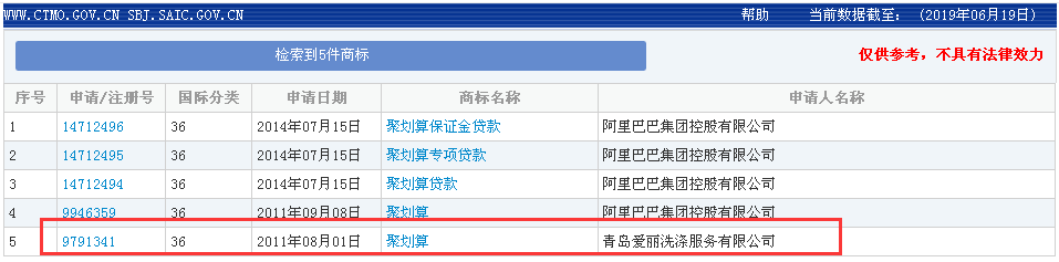 這個(gè)商標名叫“聚劃算”!乍一聽(tīng)很熟悉吧?這不是阿里巴巴集團的商標嗎?實(shí)際上,這個(gè)商標的申請人是青島愛(ài)麗洗滌服務(wù)有限公司。